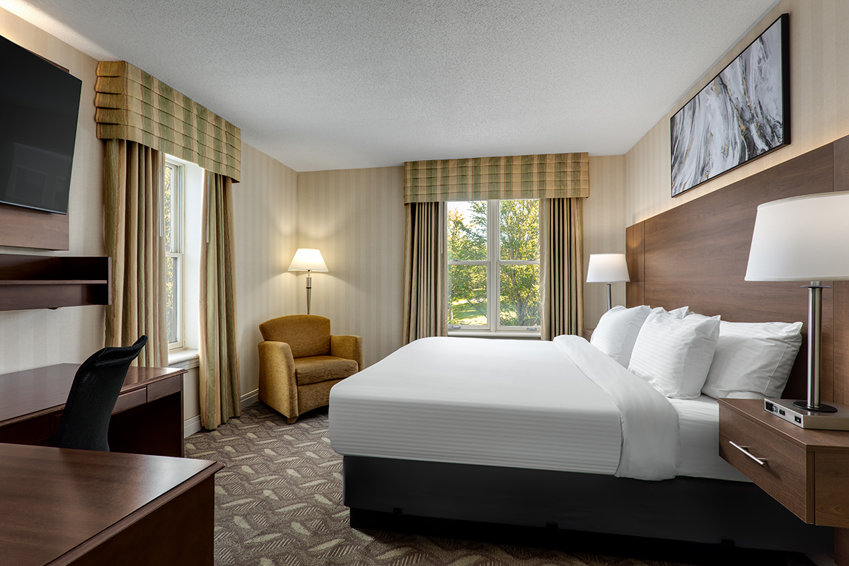Enjoy views of the Ontario parkland from our accessible guestroom with one queen bed, located in our Historical Wing.. Includes s large desk, boutique style bathroom with standing shower only, 32" TV, Complimentary wireless or high speed Internet, voicemail, iron and ironing board, hair dryer, iPod alarm clock and complimentary parking.