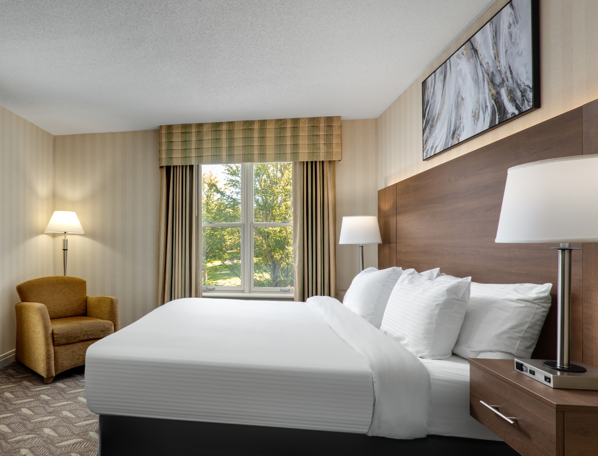 Experience a comfortable stay in our One Queen Bed guestroom. Located in the Executive Conference Wing, this room offers beautiful park views, premium amenities, and complimentary Wi-Fi, high speed Internet access, and free parking.